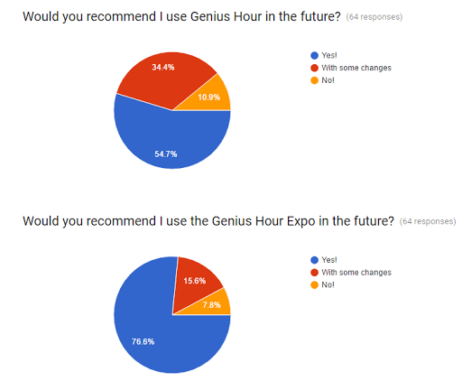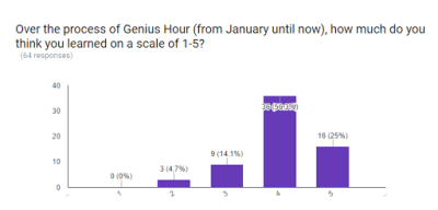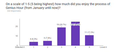 If I had the chance, I would certainly implement Genius Hour again next year. I would have a handful of things I’d want to change, but the overall premise is a very powerful idea. While I’m moving to a different position next year, I will work to involve as much student choice, project-based learning, and publishing of final products as I can. I was truly forever changed as an educator by this experience!